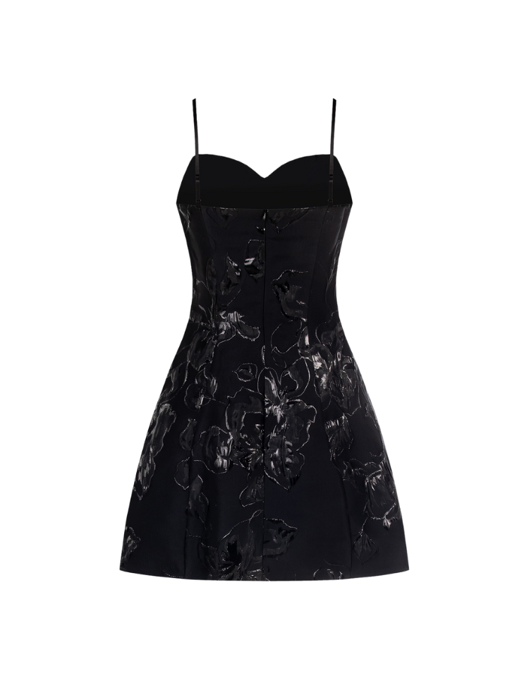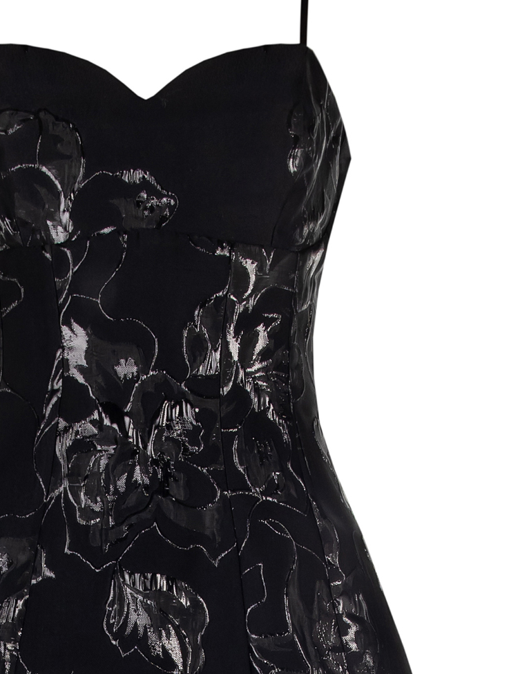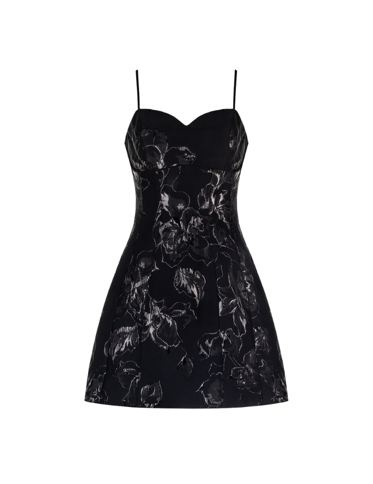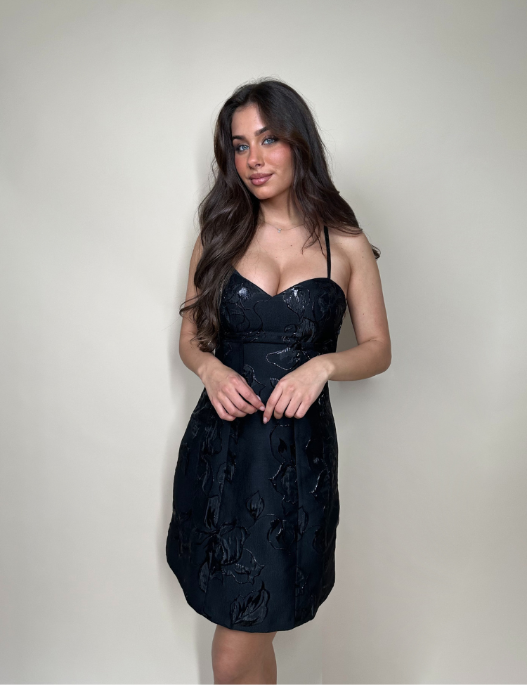 De Rinascimento Frilly-G Abi Dress in nero is een elegante cocktailjurk met een verfijnde en vrouwelijke uitstraling. De jurk heeft smalle spaghetti bandjes, een sweetheart neckline en een flatterende A-lijn pasvorm. Het luxe jacquardmateriaal is voorzien van een subtiel glanzend bloemmotief, wat zorgt voor een chique en feestelijke look.