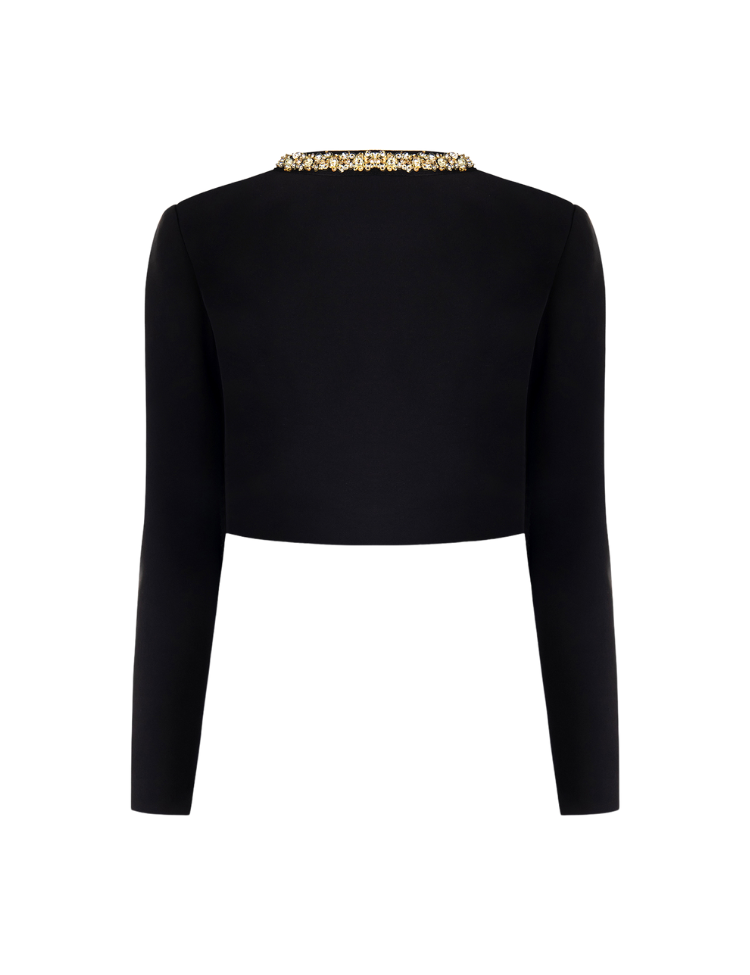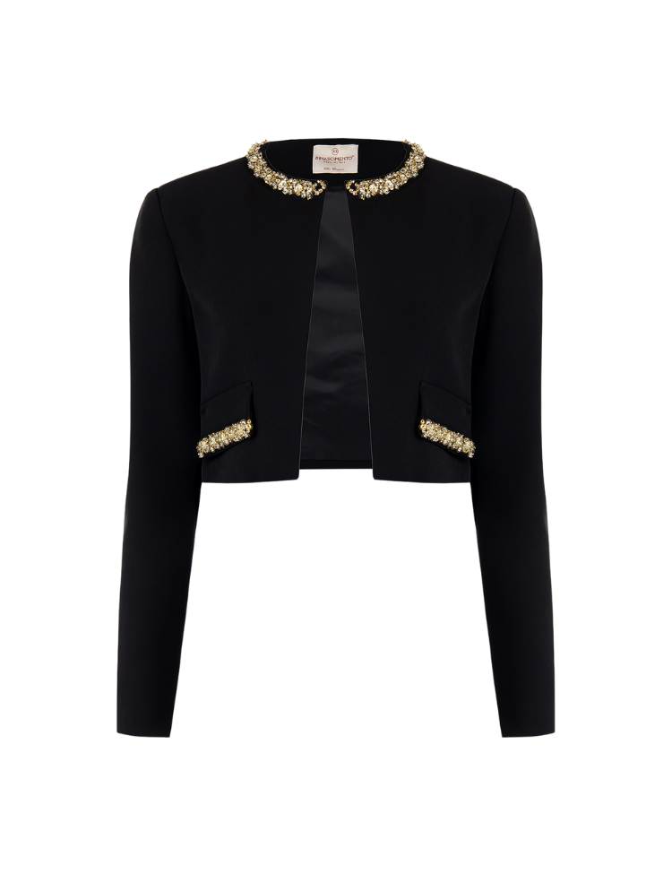 De Rinascimento Gia Bolero in nero is een korte, elegante bolero die iedere outfit een glamoureuze upgrade geeft. Het open model met lange mouwen wordt geaccentueerd door schitterende kristallen details langs de kraag en op de zakflappen. De bolero is gemaakt van hoogwaardige materialen en volledig gevoerd voor optimaal draagcomfort.