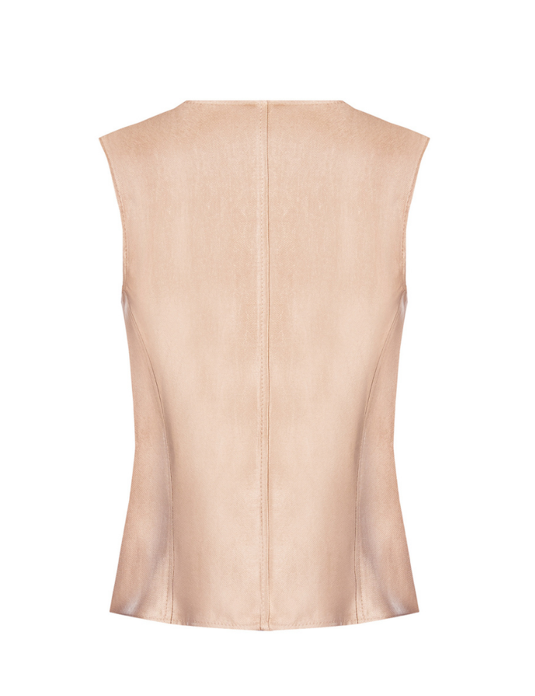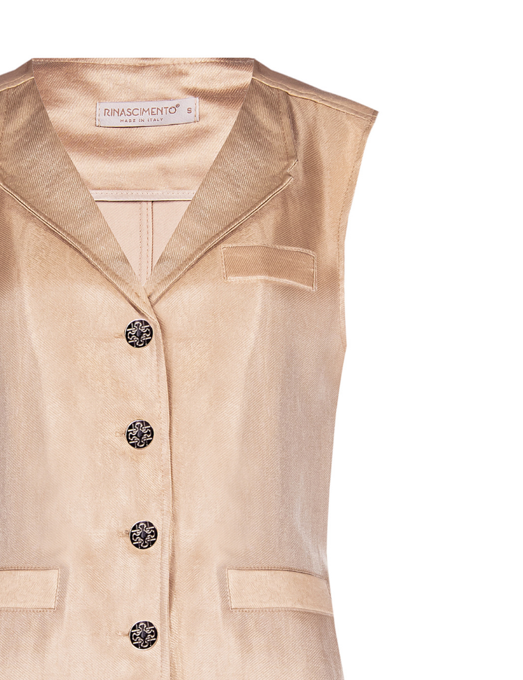 Mouwloos gilet in warme tortora beige met subtiele metallic glans. Het vest heeft een getailleerde pasvorm met revers, vijf decoratieve knopen aan de voorzijde en twee paspelzakken. De gladde stof geeft een verfijnde uitstraling. Het gilet sluit met een knoopsluiting en valt tot op de heup. Ideaal als laagje over een blouse of top.