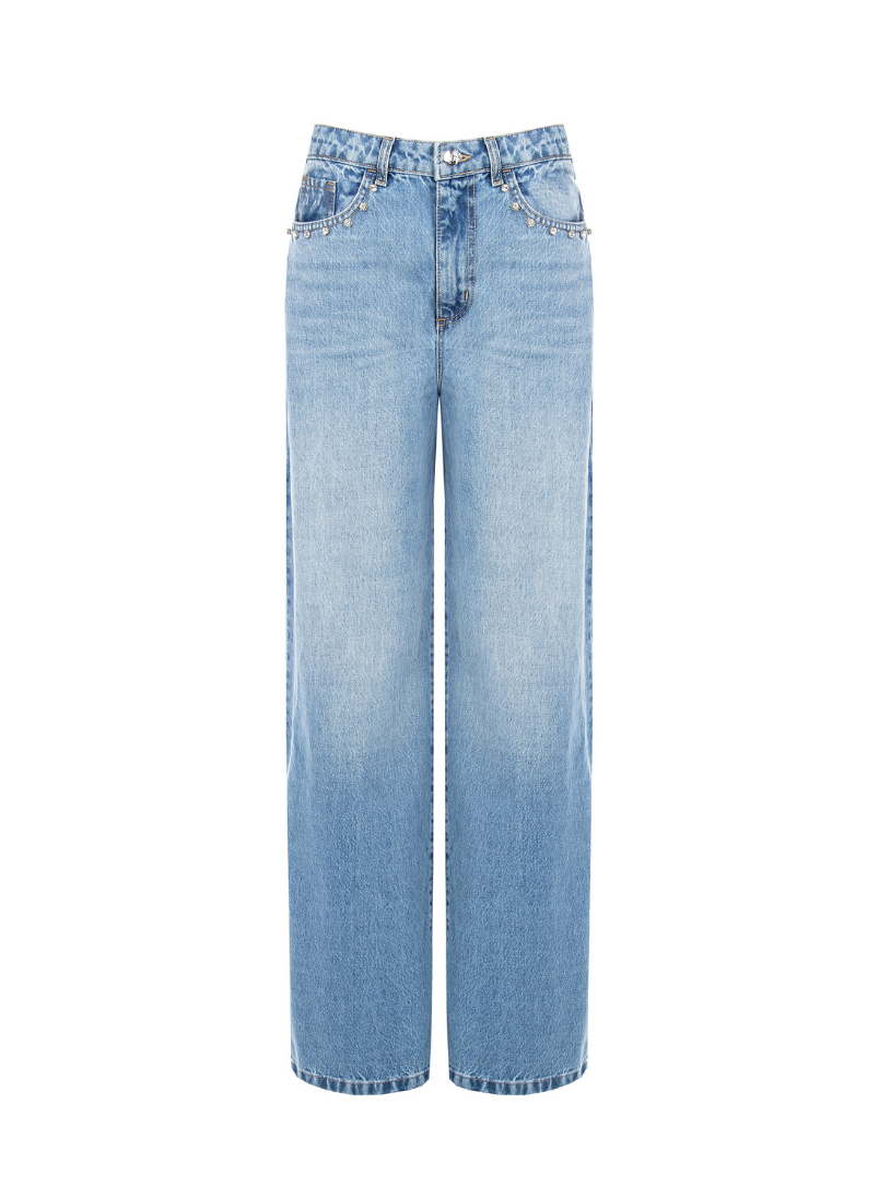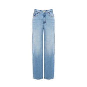 Deze lichtblauwe jeans van Rinascimento heeft een wijde, rechte pijp en een hoge taille. De denim is uitgevoerd in een lichte indigo wassing. Opvallend zijn de zilveren strass steentjes die de voorzakken accentueren en op de achterzakken doorlopen. De jeans sluit met een knoopsluiting en heeft twee steekzakken voor en twee opgestikte zakken achter. De wijde pasvorm geeft een ontspannen silhouet. Oranje contrasterende stiksels en een bruin leren label op de achterzijde maken het design compleet.