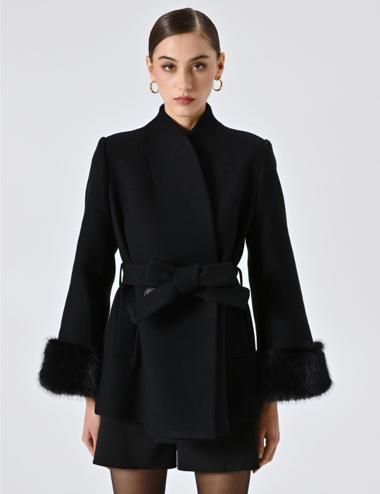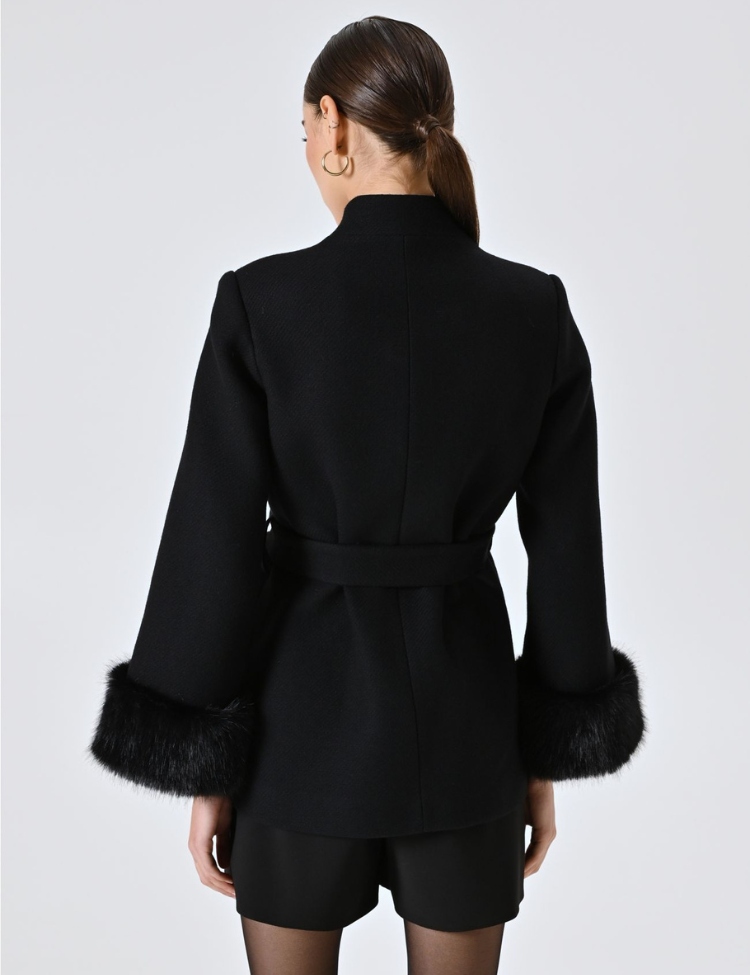 De Rinascimento Capp Jacket is een elegante en vrouwelijke jas die luxe en stijl moeiteloos combineert. Het verfijnde ontwerp heeft een getailleerde pasvorm met een prachtige strikceintuur die het silhouet accentueert. De mouwen zijn afgewerkt met zachte faux fur manchetten, wat zorgt voor een chique en opvallend detail.