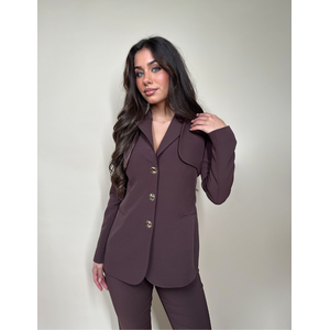 Deze chocoladebruine blazer van Rinascimento heeft een getailleerde pasvorm met een klassieke revers. Het jasje sluit met drie goudkleurige knopen en heeft afgeronde zomen aan de onderkant. De mouwen zijn afneembaar, waardoor je het item ook als gilet kunt dragen. Het jasje is uitgevoerd in een gladde, stevige stof die zijn vorm behoudt. De getailleerde snit volgt je silhouet mooi en de goudkleurige details geven het geheel een verfijnde afwerking.