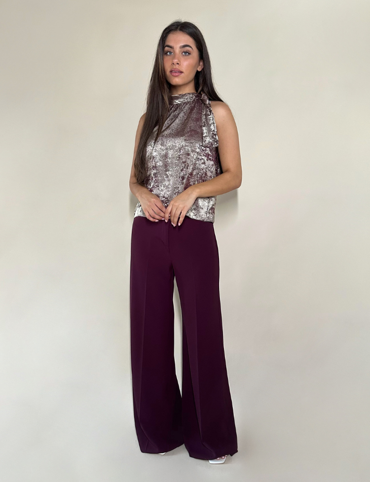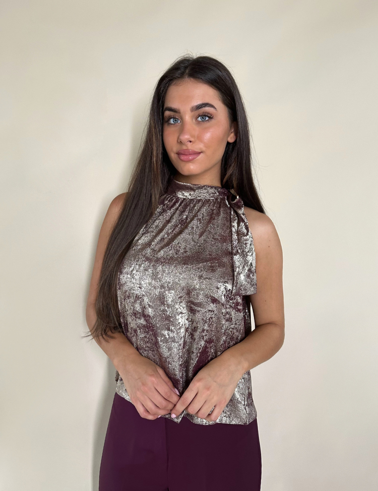 De Rinascimento Rewi Top in Bordeaux Rosso is een mouwloze top met een opvallende metallic finish in een rijke bordeauxkleur. De top heeft een rechte fit en is voorzien van een halterhals met elegante striksluiting aan de zijkant, wat zorgt voor een chique en vrouwelijke touch. Het licht glanzende materiaal vangt prachtig het licht en maakt dit item ideaal voor feestelijke gelegenheden of om je everyday look een glam boost te geven.