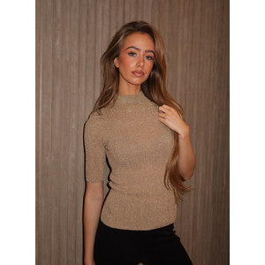 De Stefy Maglia Top van Rinascimento is een ribgebreide top met korte mouwen en een subtiele glans in een goudkleurige tint. De top heeft een hoge hals en aangesloten pasvorm. De top bevat veel stretch waardoor het een comfortabel, maar stylish item is in je garderobe.