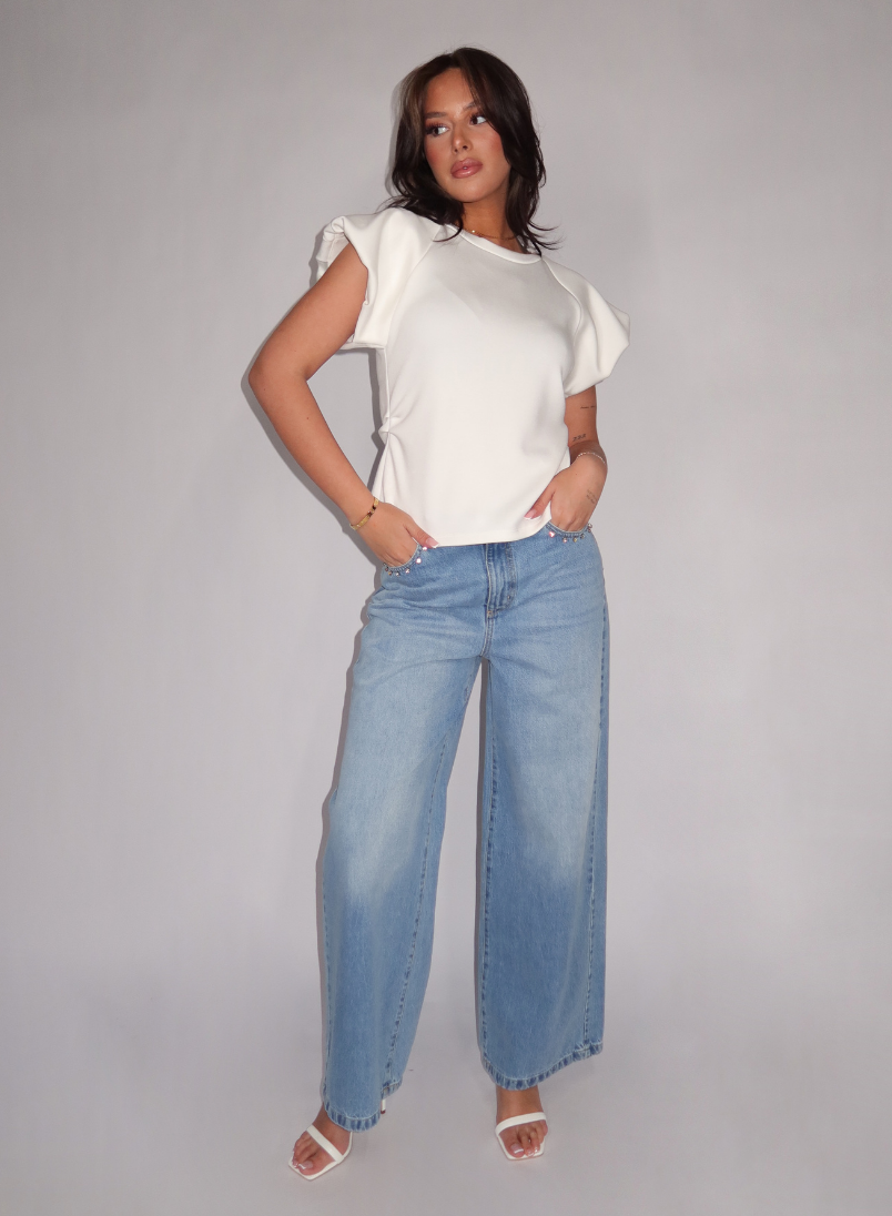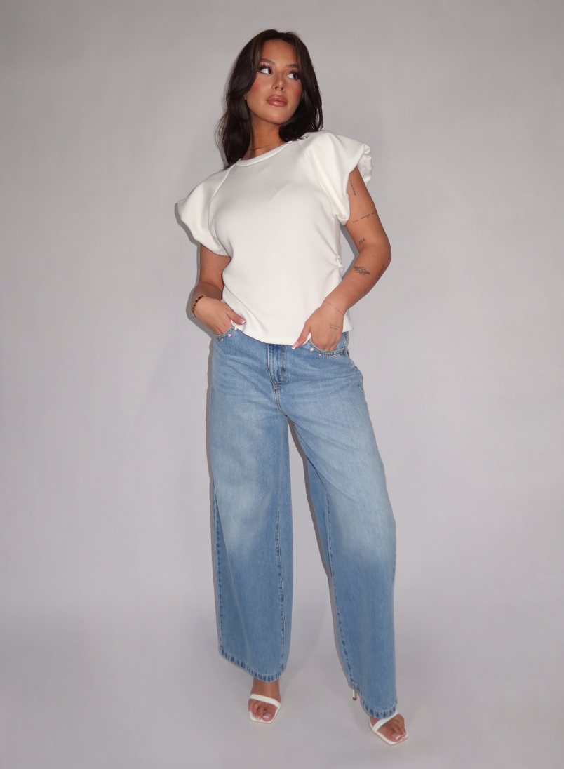 Design: Ronde hals met brede boord, korte mouwen met plooivolume