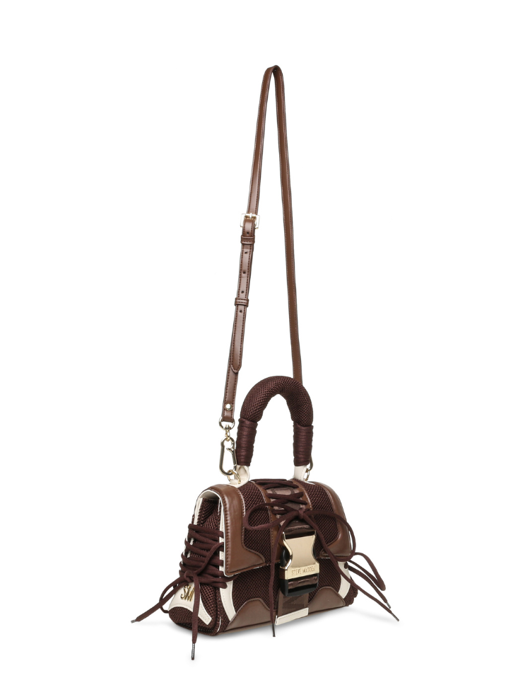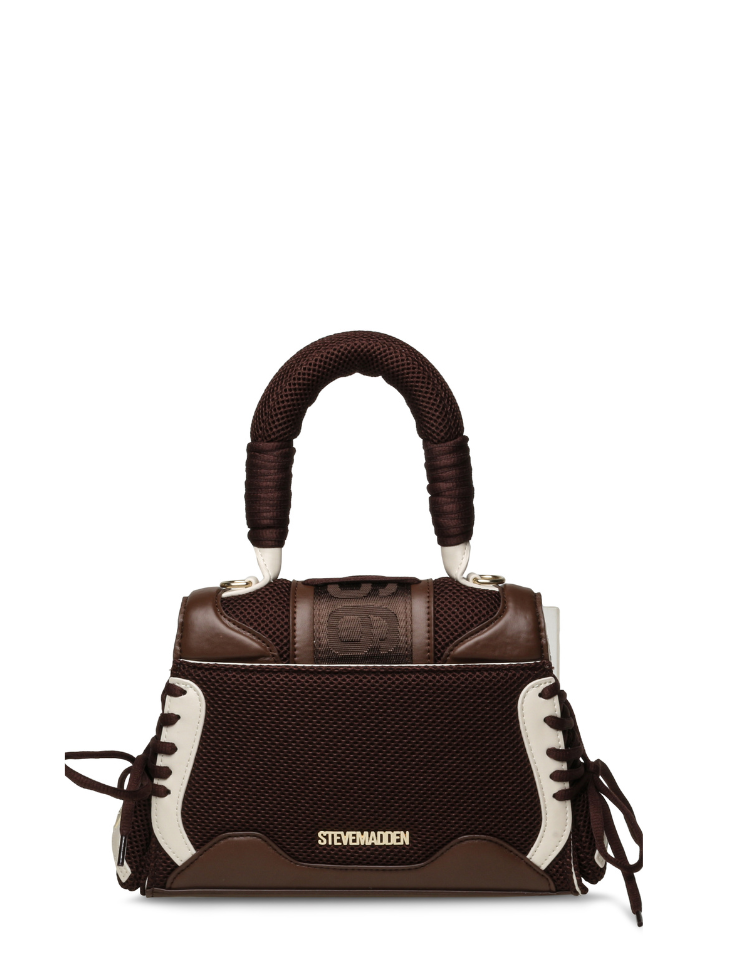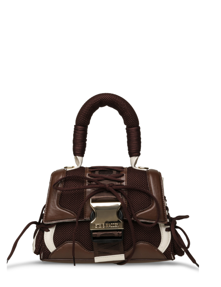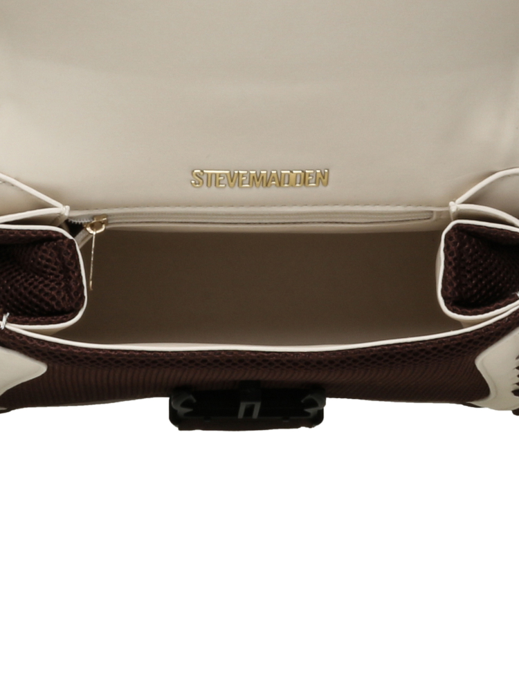Durf te onderscheiden met de Bdiego-M bag van Steve Madden: een ware fashionstatement met een edgy sportieve twist. Deze opvallende handtas combineert structuur en detail met high-end fashion vibes. De tas is uitgevoerd in een mix van stevig mesh, gladde panelen en contrasterende accenten voor een dynamische en moderne uitstraling. De vetersluiting aan de voorzijde geeft een speelse knipoog naar de Steve Madden sneakers, terwijl de oversized gesp en het Steve Madden-logo zorgen voor een luxe touch.