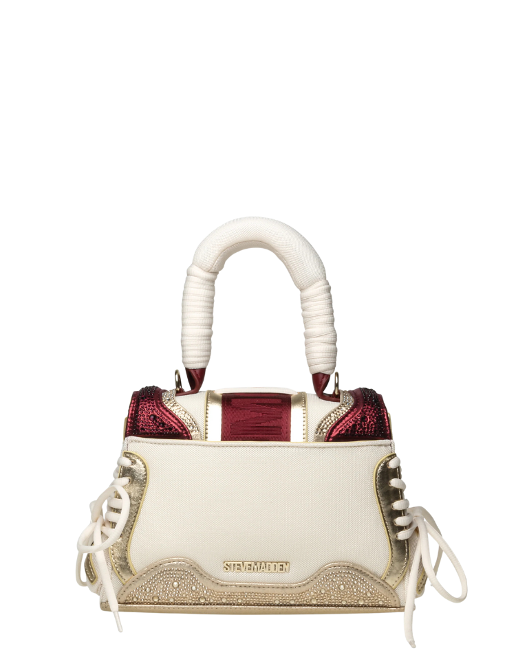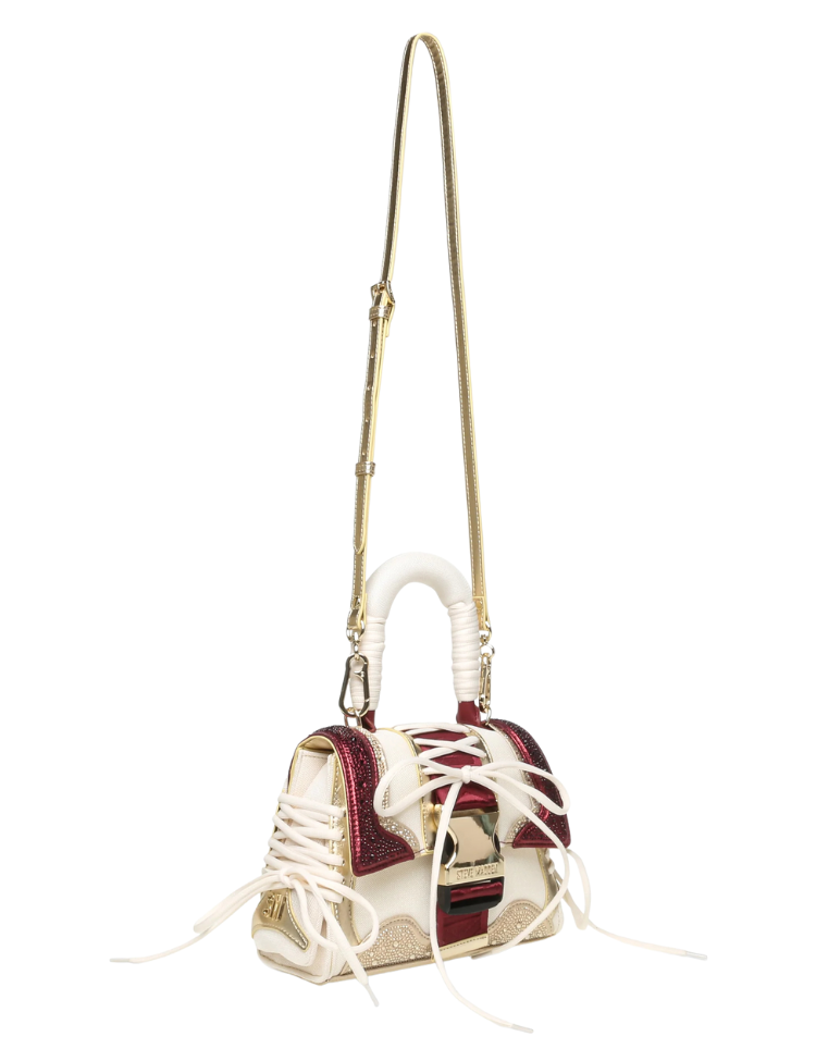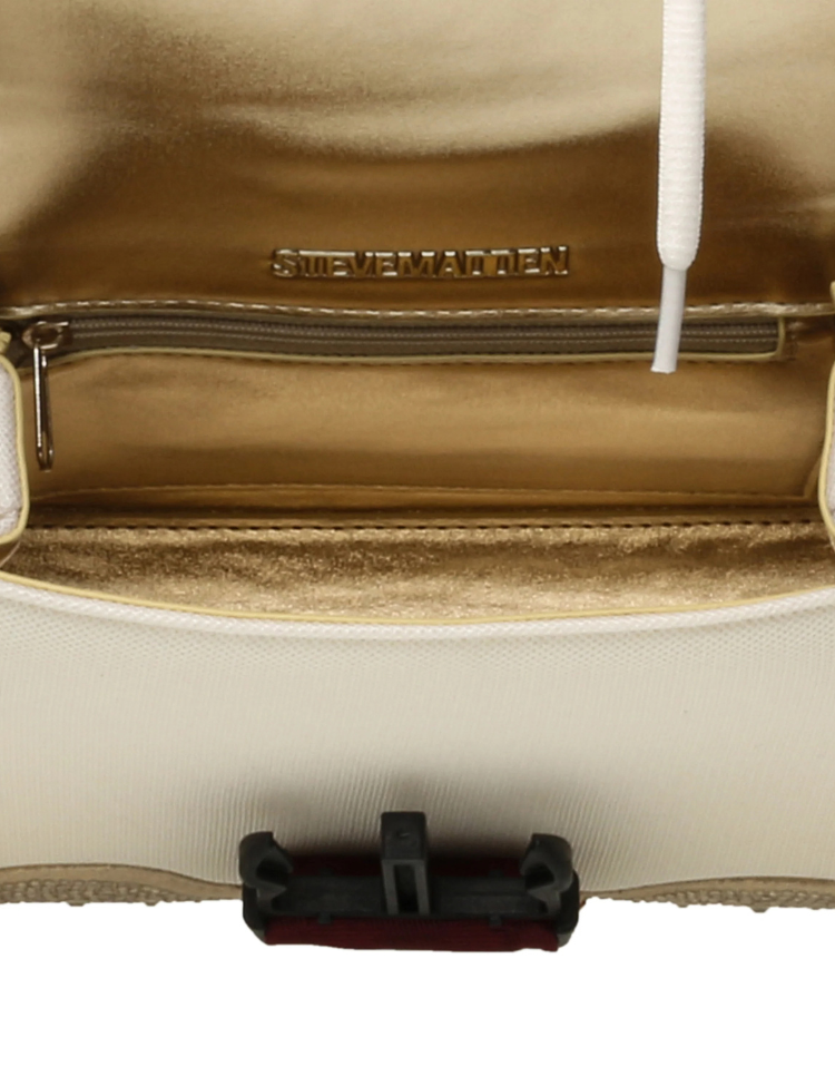 Durf te stralen met de Steve Madden Bdiego-R Bag, een handtas die high-fashion en sportieve details moeiteloos combineert. Uitgevoerd in een mix van stevig mesh en gladde synthetische panelen, heeft deze tas een dynamische uitstraling die meteen de aandacht trekt. De speelse vetersluiting aan de voorzijde verwijst naar de iconische Steve Madden sneakers, terwijl de oversized gesp en het subtiele logo zorgen voor een luxe finishing touch.