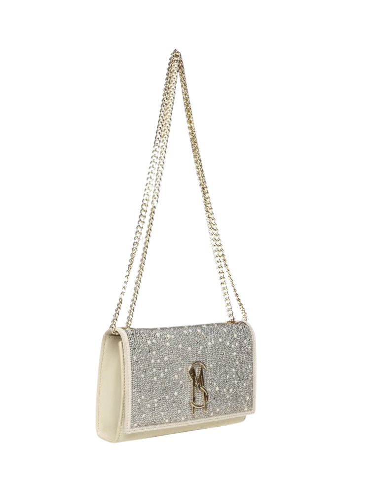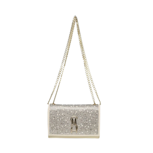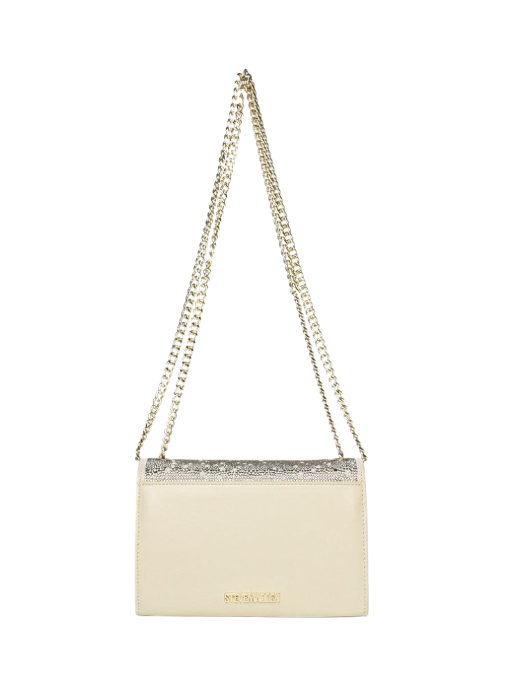 Deze crossbody tas van Steve Madden combineert een crèmekleurige basis met een voorzijde bezet met zilverkleurige steentjes. De flap heeft een goudkleurig sierelement met een quastedetail in het midden. De dubbele ketting is verstelbaar en heeft afwisselend goudkleurige en zilverkleurige schakels. Aan de achterzijde zie je een glad crèmekleurig design met goudkleurige merkopdruk. De compacte rechthoekige vorm maakt de tas praktisch en visueel aantrekkelijk.