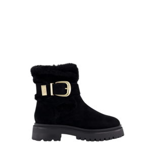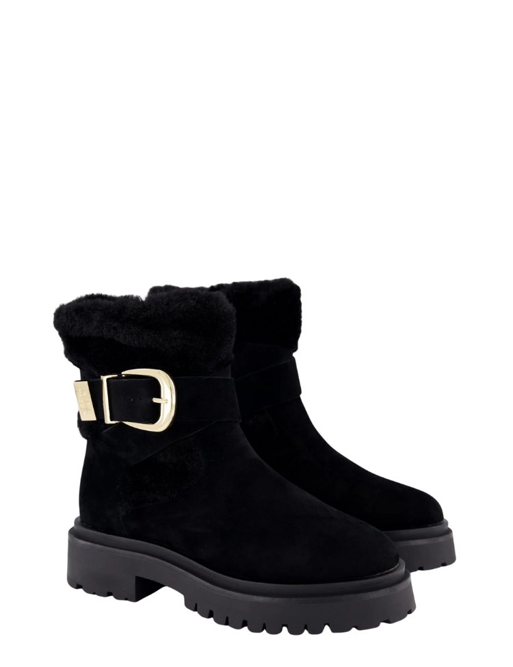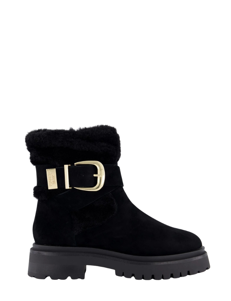 De Steve Madden Lodge Booty is dé perfecte combinatie van elegantie en stoere power. Uitgevoerd in luxe zwart suède met een zachte faux-fur afwerking straalt deze enkellaars warmte en stijl uit. Het design wordt geaccentueerd door een opvallende goudkleurige gesp die zorgt voor een chique statement, terwijl de grove zool de laars een robuuste en moderne uitstraling geeft.