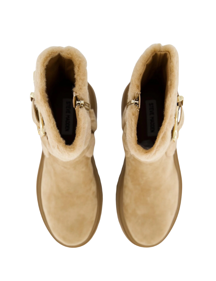 De Steve Madden Lodge Booty is dé perfecte combinatie van elegantie en stoere power. Uitgevoerd in luxe zwart suède met een zachte faux-fur afwerking straalt deze enkellaars warmte en stijl uit. Het design wordt geaccentueerd door een opvallende goudkleurige gesp die zorgt voor een chique statement, terwijl de grove zool de laars een robuuste en moderne uitstraling geeft.