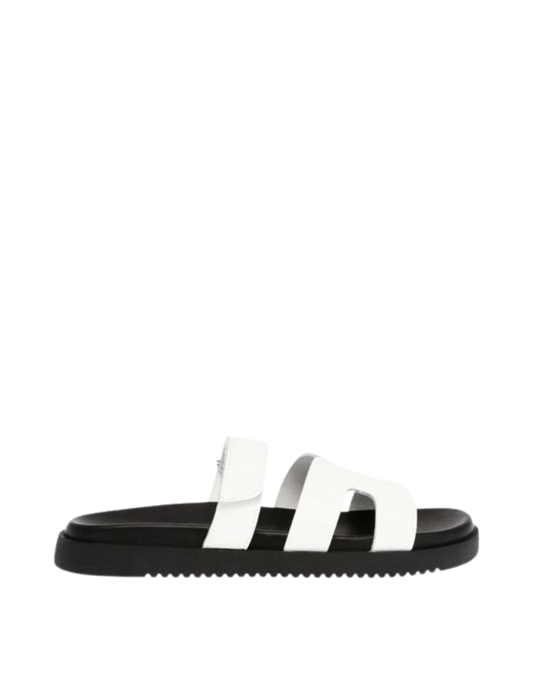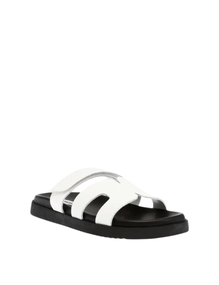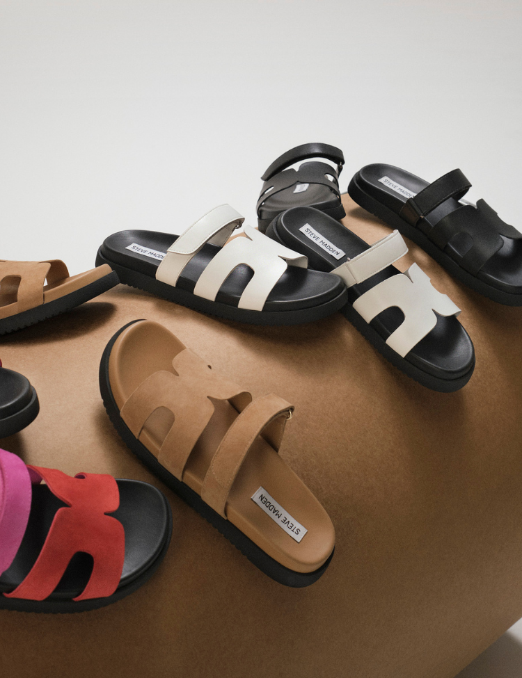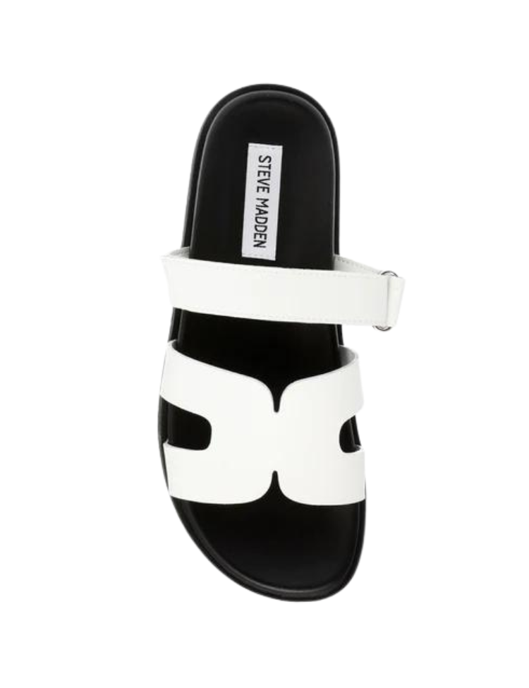 De Steve Madden Missile sandaal heeft comfortabele constructiedetails zoals een voorgevormd voetbed, een platte zool met profiel en een verstelbaar bovenbandje, plus een voorbandje met een geometrisch uitgesneden ontwerp. Verkrijgbaar in meerdere kleuren.