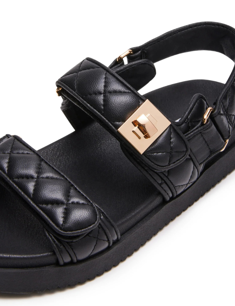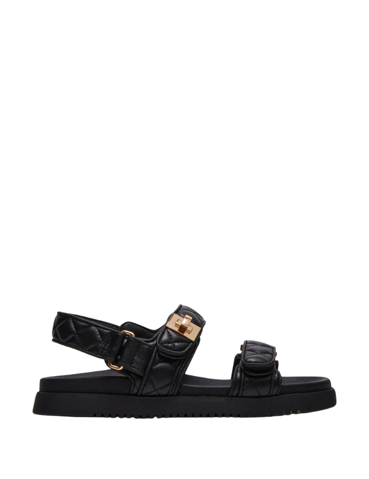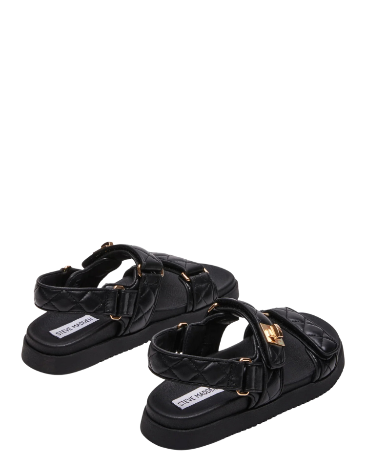 Stap moeiteloos in stijl met de Steve Madden Mona-Q Sandal. Deze zwarte casual sandaal straalt elegantie uit zonder een woord te zeggen. Het stijlvolle quilted ontwerp en het luxe leren bovenmateriaal maken deze sandaal perfect voor elke relaxte gelegenheid. Of je nu door de stad wandelt of geniet van een weekendbarbecue, deze slip-on sandaal biedt zowel comfort als een verfijnde uitstraling. Met een platformhoogte van 2 cm en een aanbeveling om een maat groter te bestellen, is deze sandaal de ultieme keuze voor diegenen die op zoek zijn naar zowel gemak als een statement. Tijd om je stijl te laten spreken!