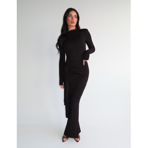 Deze zwarte lange rok van Unique The Label heeft een opvallende striksluiting aan de zijkant. De maxi rok valt soepel langs je lichaam en heeft een strakke, getailleerde pasvorm rondom de heupen. Het lange strikdetail creëert een verfijnde draperiedetail langs de zijkant. De rok heeft een hoge taille en loopt elegant uit in een vloerlange lengte.