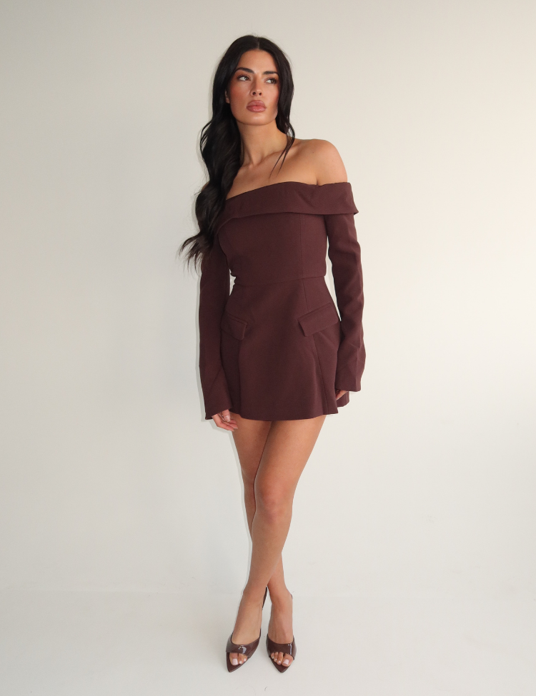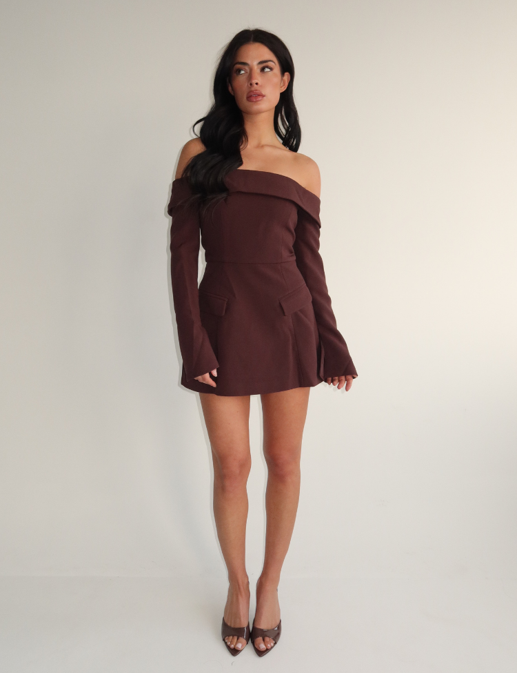 Deze off-shoulder jurk in chocoladebruin heeft een strakke, korte pasvorm die je silhouet accentueert. De jurk valt net boven de knie en heeft lange mouwen die doorlopen tot over de polsen. Het elastische bovengedeelte zorgt voor een comfortabele pasvorm rond de schouders en decolleté. De gladde stof heeft een subtiele stretch die mooi aansluit op je lichaam. Perfect voor avonden uit waarbij je stijlvol voor de dag wilt komen.