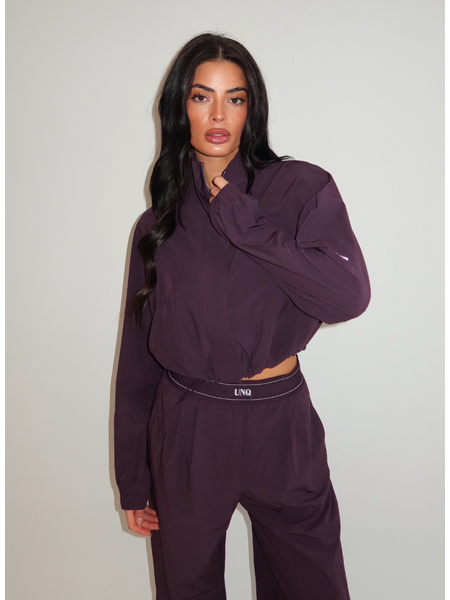Deze verfijnde bomberjacket in deep berry combineert comfort met een moderne uitstraling. Het soepele materiaal heeft een subtiele glans die het luxe karakter benadrukt. De jacket kenmerkt zich door de opstaande kraag met kleine V-halsuitsnede, elastische boorden aan de mouwen en taille voor een perfecte pasvorm. De ritssluiting aan de voorzijde zorgt voor veelzijdigheid in styling. Deze cropped bomber valt net op de taille en heeft een relaxte fit door de ballonmouwen die elegantie toevoegen aan je outfit.