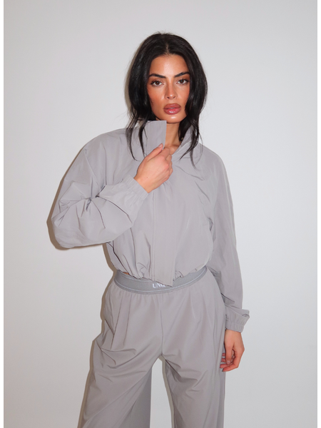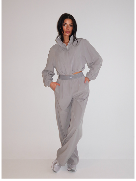 Draag dit bomberjack over de bijpassende grijze broek voor een complete loungewear set. De cropped lengte en elastische tailleband creëren een flatterende silhouet. Unique The Label zorgt voor verfijnde loungewear die je zowel thuis als daarbuiten kunt dragen.