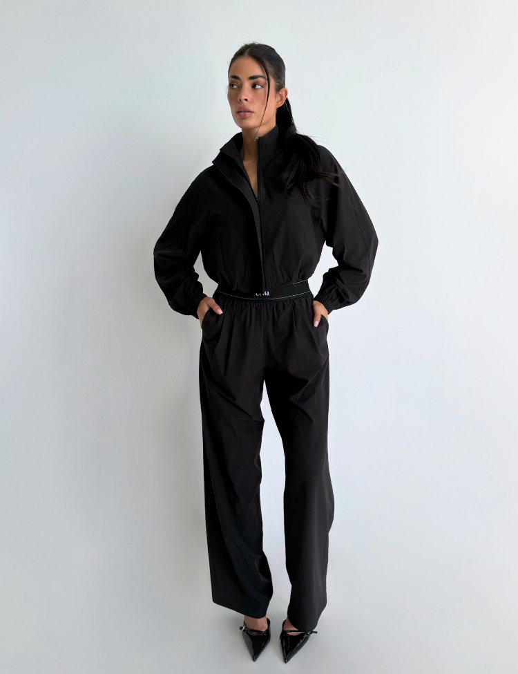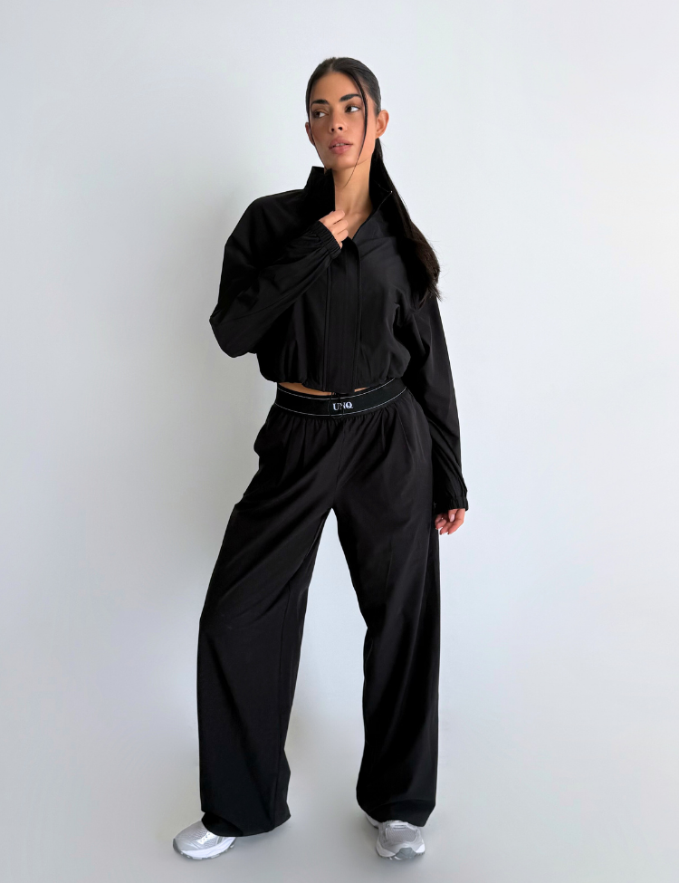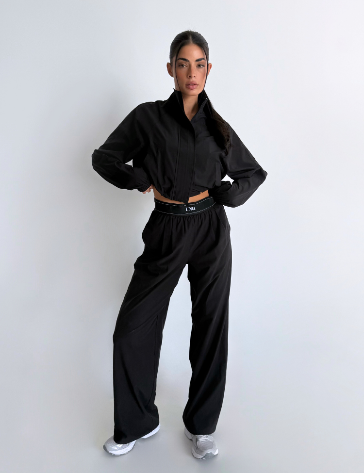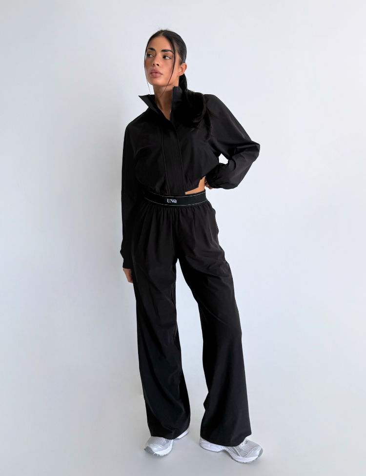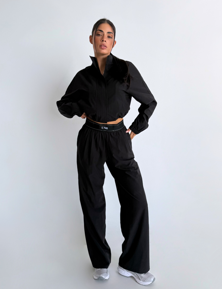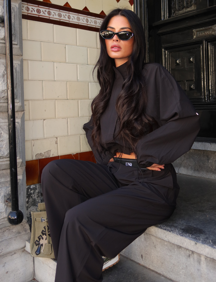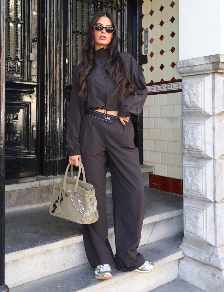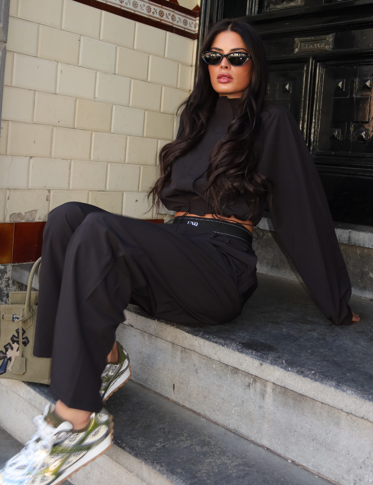 Combineer deze zwarte broek met de bijpassende cropped hoodie voor een complete loungewear set. De witte sneakers maken het geheel af voor een casual maar verzorgde look. Unique The Label staat bekend om luxe loungewear die comfort en stijl verenigt.