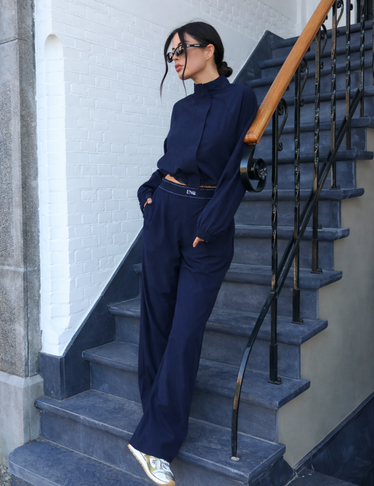 Combineer deze navy pantalon met de bijpassende cropped top voor een complete loungewear set van Unique The Label. De wijde pijpen staan elegant met sneakers voor een casual uitstraling.