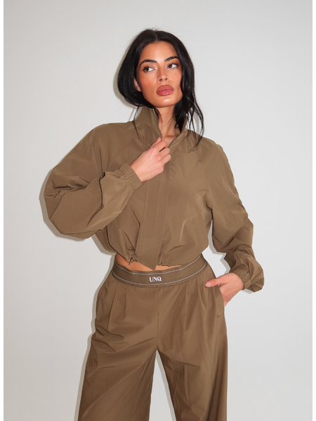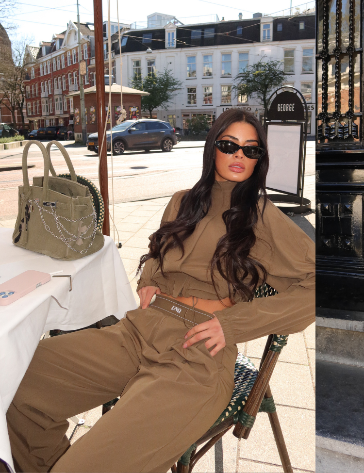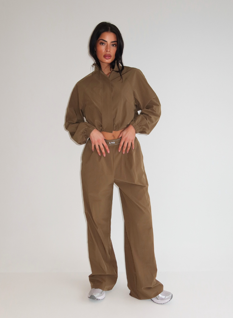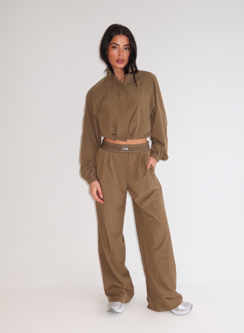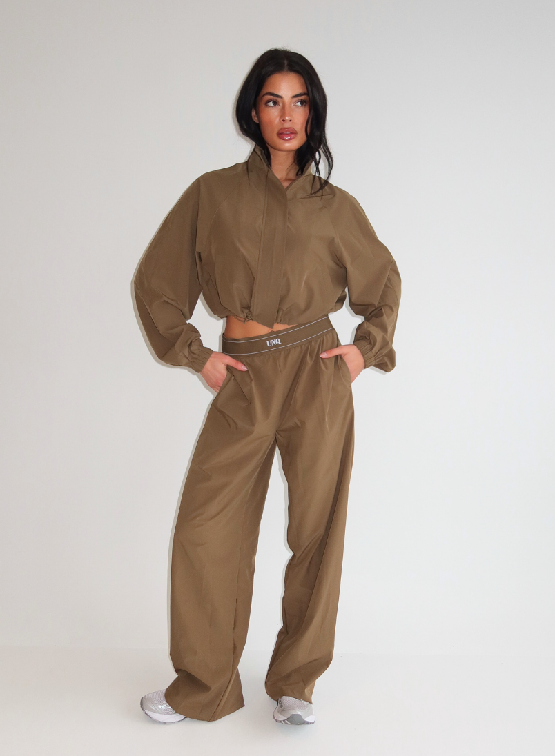 De Gigi broek wordt gedragen met het bijpassende cropped jasje voor een complete set. Unique The Label presenteert deze tweedelige outfit met sneakers voor een sportieve twist.