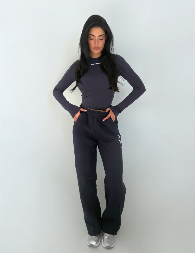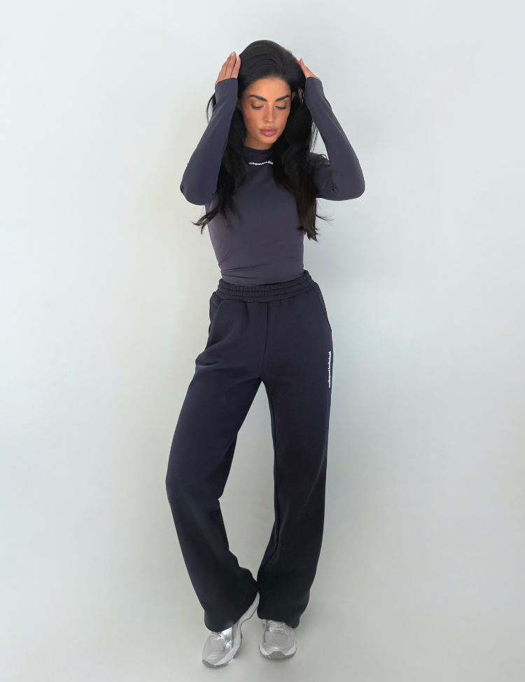 De Imani Jogger van Unique The Label combineert perfect met het bijpassende donkerblauwe longsleeve shirt voor een complete loungewear look. De metallic sneakers voegen een trendy accent toe aan je outfit.