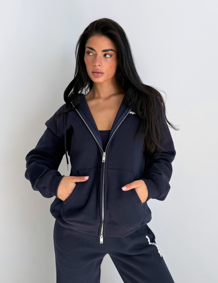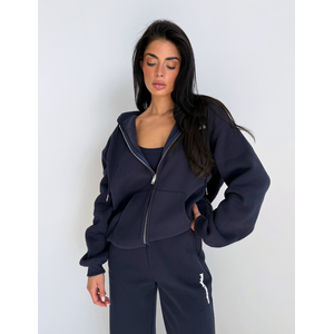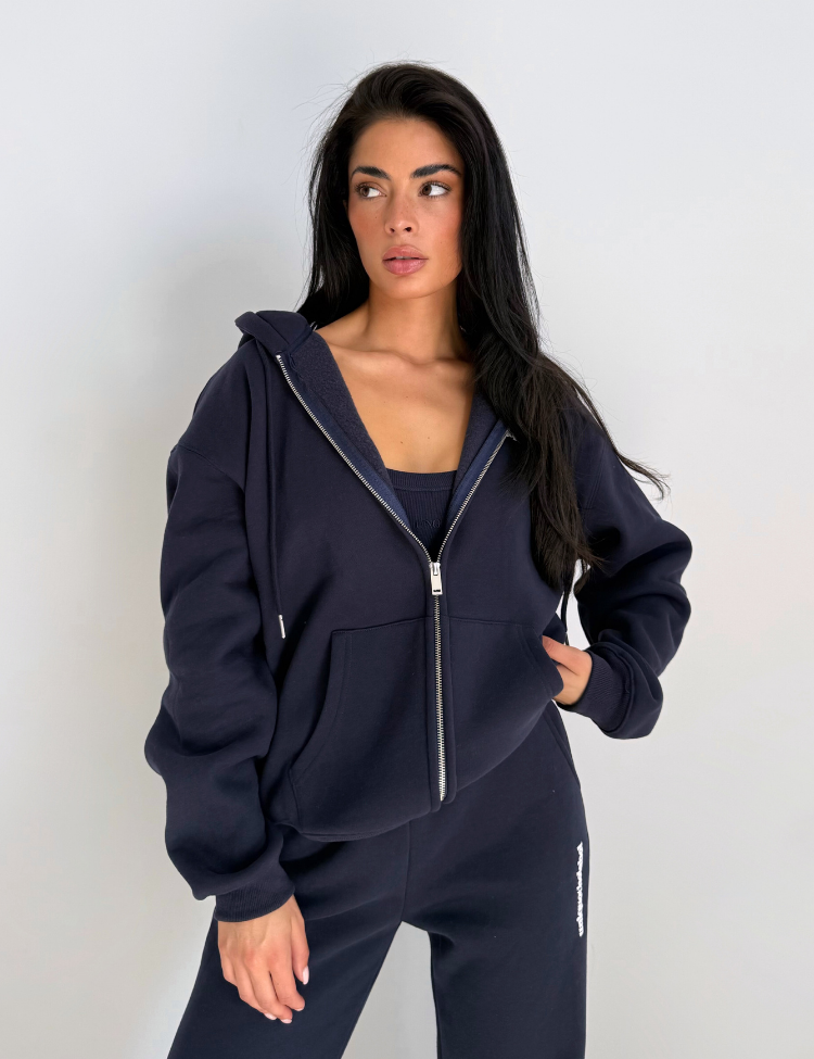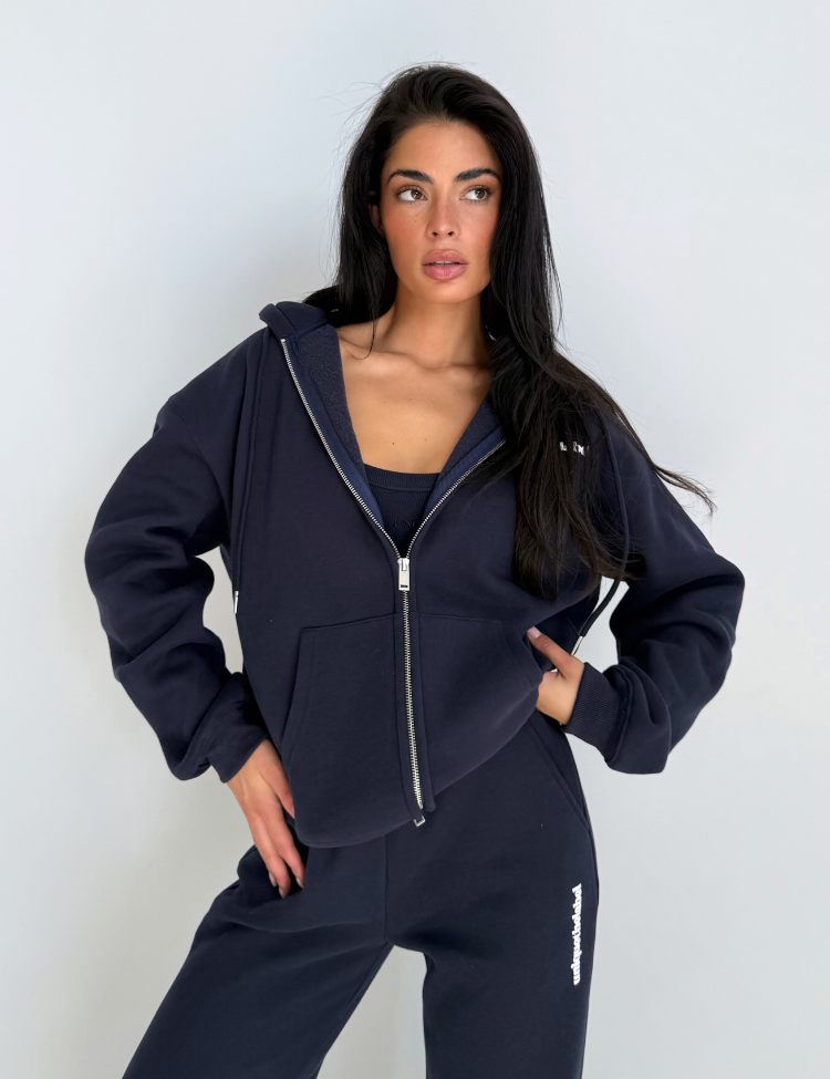 Dit donkerblauwe vest van Unique The Label kenmerkt zich door de oversized pasvorm met comfortabele capuchon. De doorlopende rits met zilverkleurige details en de tekstprint op de borst geven het vest een moderne uitstraling. De kangoeroezakken aan de voorzijde bieden praktische opbergruimte, terwijl de ribgebreide boorden bij de mouwen en zoom zorgen voor een perfecte afsluiting. Het zachte materiaal voelt aangenaam aan en de relaxte snit geeft je alle bewegingsvrijheid die je nodig hebt.
