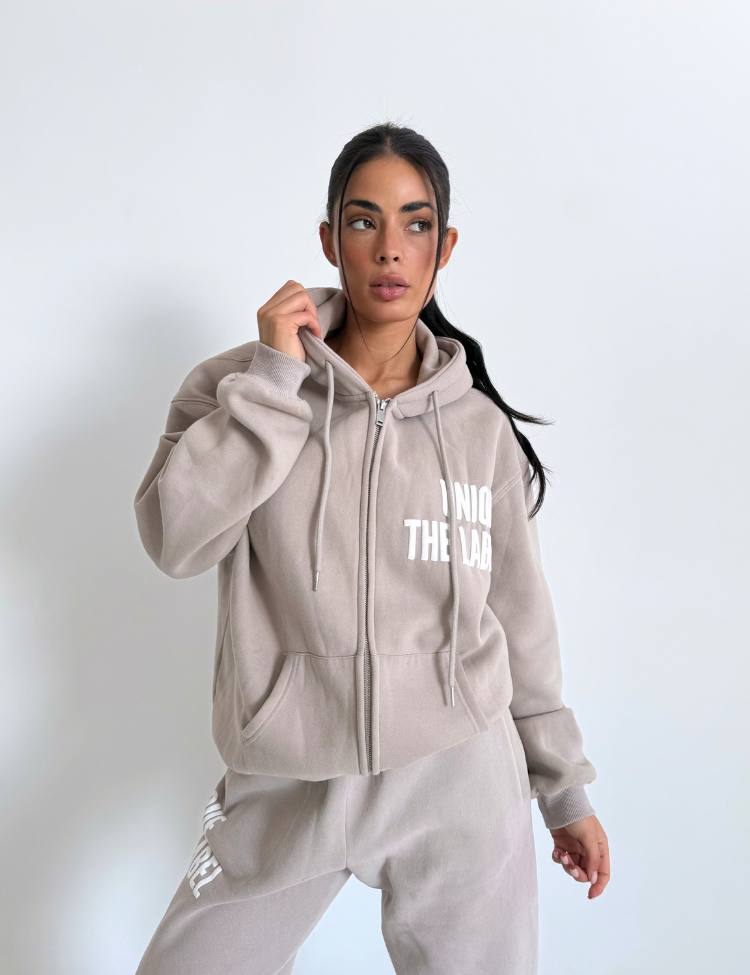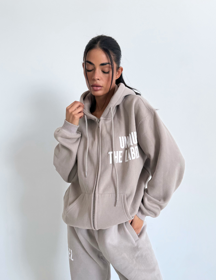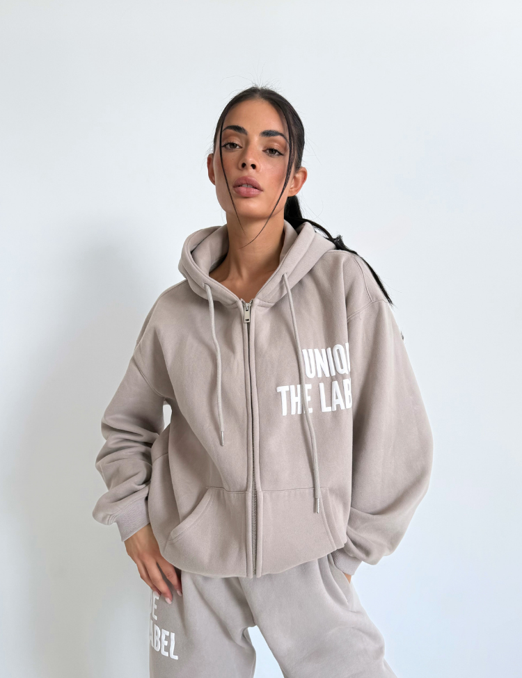 Deze mocha kleurige hoodie vest combineert zachte loungewear met een verfijnde uitstraling. Het oversized vest heeft een doorlopende rits, capuchon met trekkoord en praktische kangurozakken aan de voorzijde. Op de borst staat "UNIQUE THE LABEL" in witte letters geprint. De ribgebreide boorden bij de mouwen en zoom zorgen voor een comfortabele pasvorm. Dit luxe vest is uitgevoerd in een neutrale taupe tint die bij elke garderobe past.