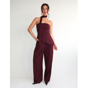 Deze burgundy pantalon van Unique The Label heeft een wijde pijp die soepel doorloopt vanaf de taille. Het ontwerp kenmerkt zich door de hoge taille en de rechte, ruimvallende pasvorm die je benen optisch verlengt. De broek valt in een gladde stof met subtiele plooien vanaf de tailleband. Door de wijde snit en de rijke bordeauxrode tint creëer je direct een verfijnde look die zowel zakelijk als feestelijk werkt.