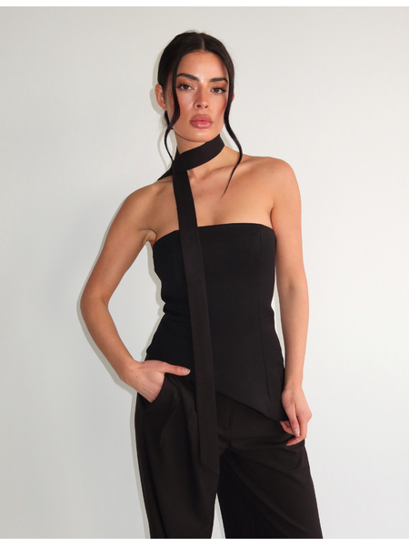 Deze strapless top kenmerkt zich door een asymmetrische halterband die vanaf de rechte bandeau-lijn omhoog loopt naar de hals. Het zwarte topje heeft een aansluitende pasvorm die je taille accentueert. De gladde stof voelt zacht aan en de halterband sluit met een strikdetail in de nek. Perfect voor avonden waarin je een verfijnde uitstraling zoekt, combineer je deze mouwloze top met bijpassende pantalons of een elegante rok.