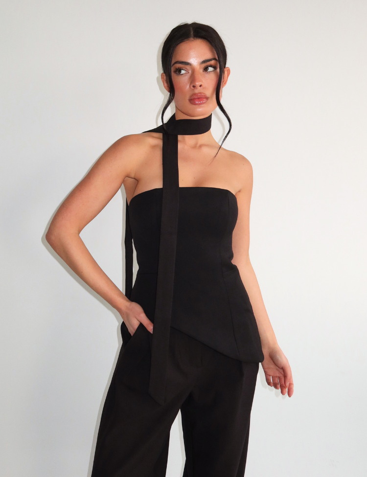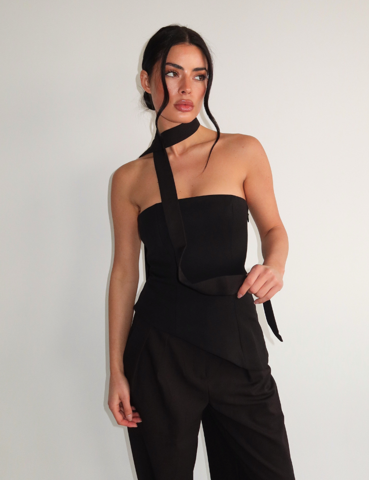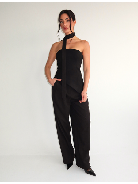 De zwarte pantalon op de foto vormt samen met deze haltertop een sophisticated ensemble van Unique The Label. De strakke lijnen van beide kledingstukken creëren een gestroomlijnde silhouet die je figuur mooi benadrukt.