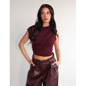 Deze gedrapeerde burgundy top kenmerkt zich door asymmetrische plooien die diagonaal over het voorpand lopen. De off-shoulder snit laat één schouder vrij en creëert een speelse cropped silhouet. Het zachte materiaal valt soepel en vormt natuurlijke drapering rondom je lichaam. De korte mouwen zijn asymmetrisch vormgegeven, waarbij de stof elegant over de schouders valt. Deze veelzijdige top in rijke bordeauxrode kleur combineert verfijnde details met een moderne pasvorm die je taille accentueert.