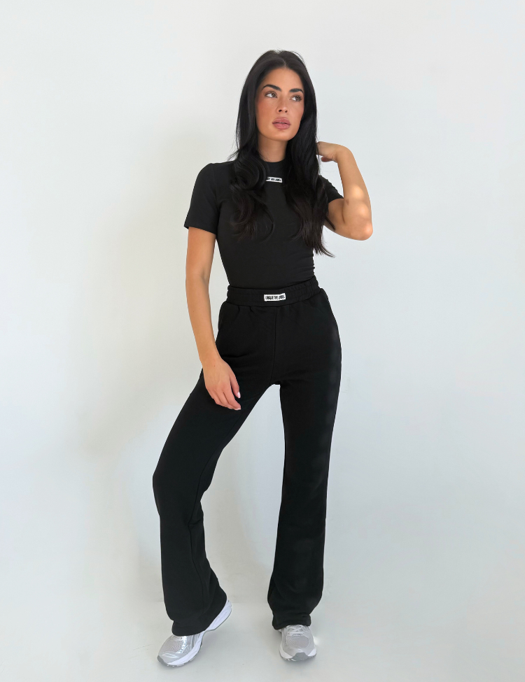 Combineer deze zwarte pantalon met het bijpassende zwarte shirt voor een stijlvolle loungewear set. De flared fit van de broek balanceert perfect met het aansluitende bovenstuk. Draag deze comfortabele set met sneakers voor een relaxte dagelijkse outfit. Unique The Label biedt hiermee een complete look die zowel thuis als buitenshuis draagbaar is.