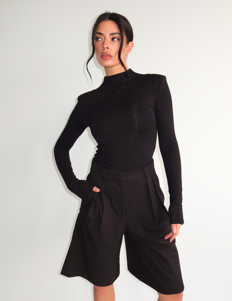 De Novie bermudashort van Unique The Label combineert uitstekend met de zwarte coltrui bodysuit zoals gestyled op de foto. De lange mouwen en hoge halslijn van het bovenstuk creëren een verfijnde balans met de wijde bermuda. Zwarte pumps met enkelbandje verlengen je benen optisch en maken de outfit compleet.