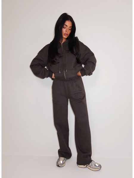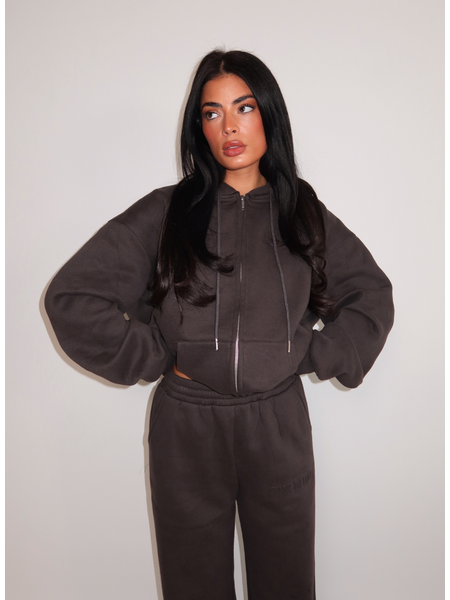 Dit charcoal grijze vest heeft een relaxed silhouet met opvallend wijde mouwen die volume creëren. De hoodie met trekkoorden geeft het kledingstuk een sportieve twist, terwijl de doorlopende ritssluiting voor praktisch draagcomfort zorgt. Het vest valt op heuplengte en heeft elastische boorden bij de zoom en mouwen die de pasvorm accentueren. De zachte stofstructuur en moderne oversized snit maken dit loungewear item geschikt voor verschillende gelegenheden. De neutrale charcoal tint combineert gemakkelijk met andere kleuren uit je garderobe.