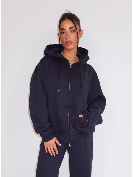 Deze donkerblauwe hoodie vest van Unique The Label combineert luxe loungewear met een verfijnde uitstraling. Het vest heeft een comfortabele capuchon met trekkoordjes en een doorlopende ritsluiting in zilverkleurig metaal. De ruime pasvorm geeft je alle bewegingsvrijheid, terwijl de kangoeruzakken voorop praktisch zijn voor je essentials. Het zachte materiaal in deep navy blue voelt heerlijk aan op de huid. Deze veelzijdige hoodie draag je thuis voor ultiem comfort of combineer je met een chique broek voor een stijlvolle casual look.