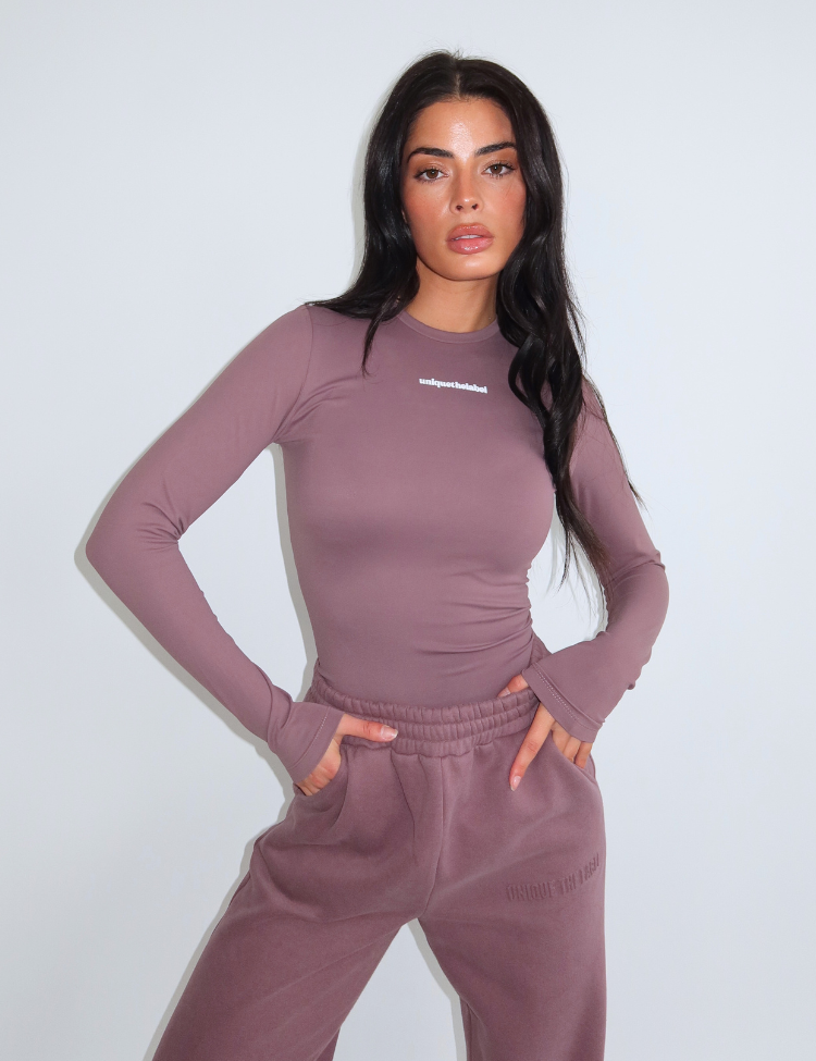 Combineer deze mushroom longsleeve met de bijpassende joggingbroek voor een complete loungewear set van Unique The Label. De ton-sur-ton styling creëert een verfijnde, monochrome outfit die zowel thuis als daarbuiten gedragen kan worden.