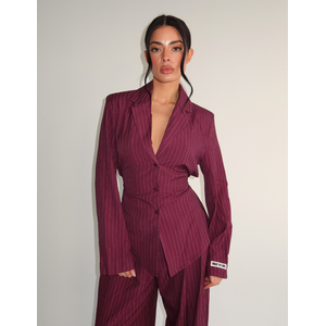 Deze cherry rode blazer met fijn krijtstreepdessin kenmerkt zich door de getailleerde pasvorm en asymmetrische sluiting. De reverskraag loopt vloeiend over in een dubbele knoopsluiting die de taille accentueert. Het jasje heeft lange mouwen met een subtiel label detail bij de pols. De scherpe schouderpartij en taillering creëren een verfijnd silhouet dat zowel zakelijk als casual draagbaar is.
