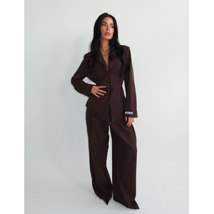 Deze chocoladebruine pantalon van Unique The Label heeft een verfijnd krijtstreepdessin dat je look direct een luxe uitstraling geeft. De broek heeft een hoge taille met tailleband en valt in een wijde, lange pijp die elegant doorloopt tot de grond. Het soepele materiaal zorgt voor bewegingsvrijheid terwijl de rechte snit je silhouet mooi accentueert. De subtiele krijtstreep en rijke bruine kleur maken deze wide leg pants perfect voor zowel zakelijke als casual chique momenten.
