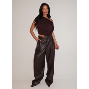 De bruine faux leather broek van Unique The Label combineert perfect met de gedrapeerde one-shoulder top voor een complete outfit die luxe en comfort verenigt.