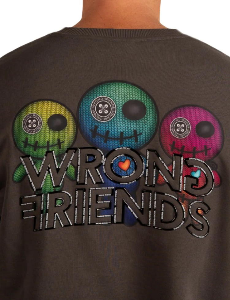 De Wrong Friends Walden Sweater - Grey is een regular fit sweater gemaakt van katoen. Op de borst staat een klein Wrong Friends-logo. De achterkant is voorzien van een grote print met het merklogo en meerdere kleurrijke skulls. De sweater heeft een ronde hals en ribboorden bij de mouwen, hals en zoom. Verkrijgbaar in meerdere kleuren.