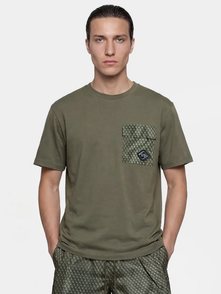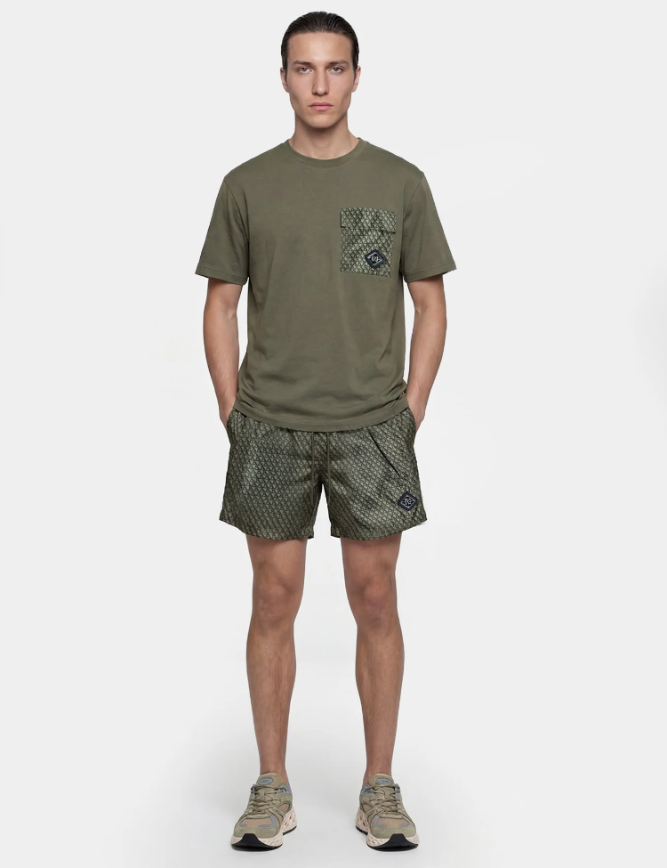 Dit combi-set van XPLCT Studios in army green bestaat uit een T-shirt met ronde hals en een matching short. Het shirt heeft een borstzak met all-over monogram print en een logo patch. De short is volledig voorzien van dezelfde monogram dessin, met steekzakken en een logo badge op het been. Samen vormen ze een strakke, sportieve set met karakter.