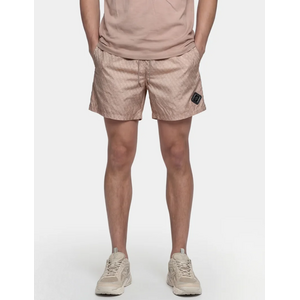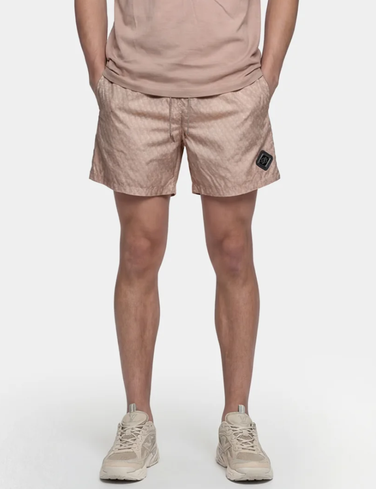 Deze beige zwembroek van XPLCT Studios heeft een all-over tonal print die subtiel in de stof is verwerkt. Op het linkerbeen zit een zwart rubber logopatch met merkbranding. De short heeft steekzakken aan de voorzijde en valt kort boven de knie. De lichte, warme beigetint maakt deze heren swimshort een sterke keuze voor zonnige dagen.