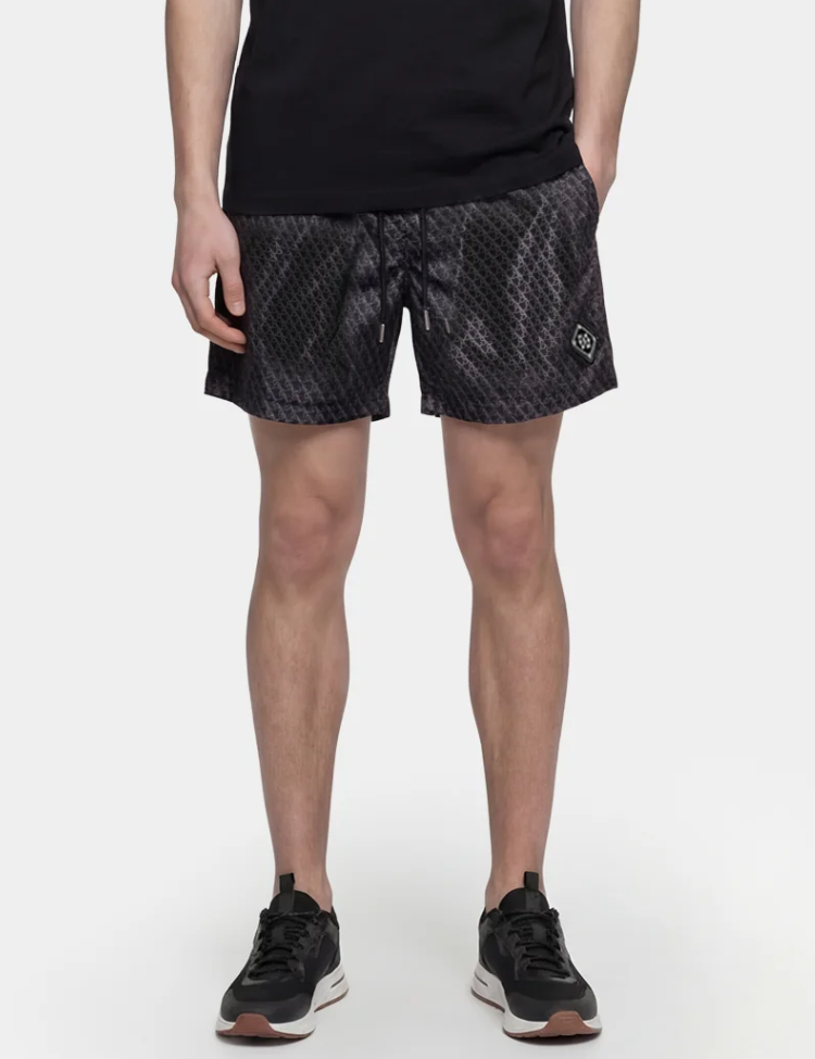 Zwarte zwemshort van XPLCT Studios met een all-over monogram print in grijs. De korte broek heeft een elastische tailleband met drawstring en metalen uiteinden. Aan de zijkant zit een ritszak voor je spullen. Op het linkerbeen vind je het herkenbare XPLCT logo patch. Deze heren zwembroek combineert een opvallend design met een comfortabele pasvorm, perfect voor aan het water of in de stad.