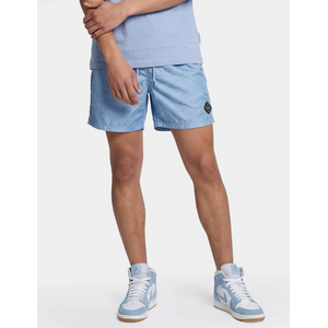 Deze lichtblauwe zwembroek van XPLCT Studios heeft een all-over monogram print die de short direct herkenbaar maakt. De taille is voorzien van een drawstring met metalen uiteinden waarop het XPLCT logo is gegraveerd. Aan de zijkant zit een zak met ritssluiting en op het linkerbeen vind je een ruitvormig merklogo. Een korte zwemshort met een sportieve uitstraling, perfect voor warme dagen.