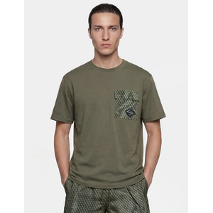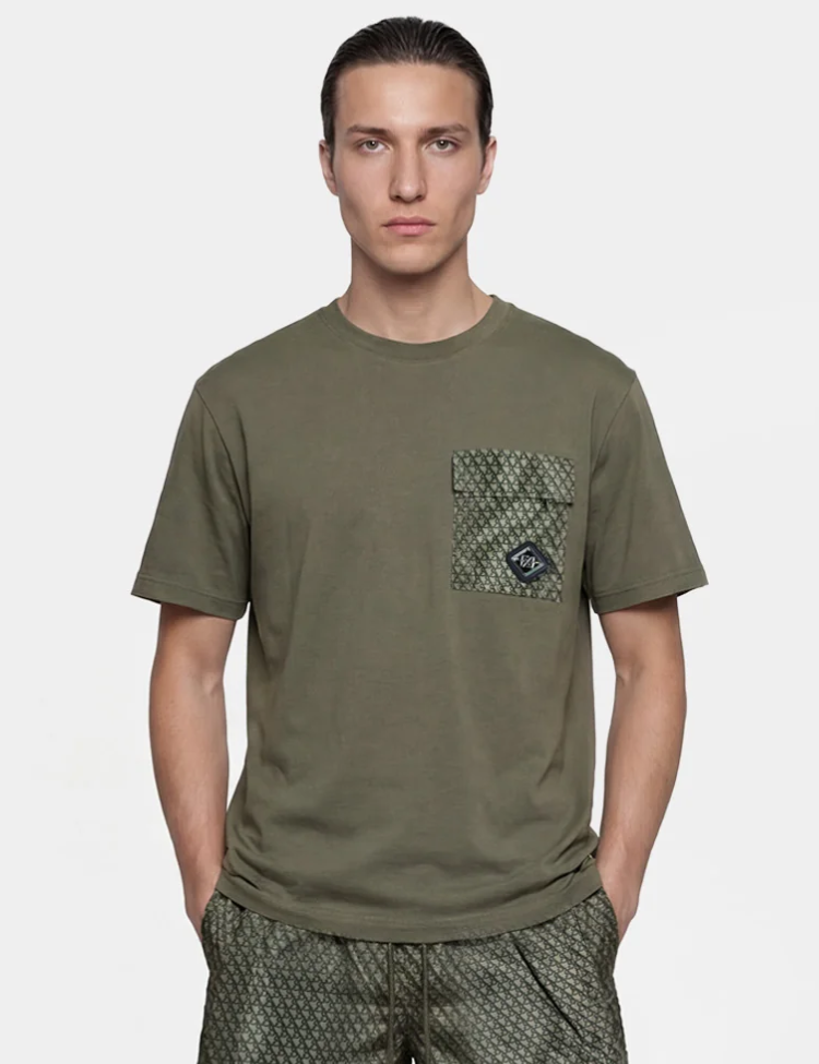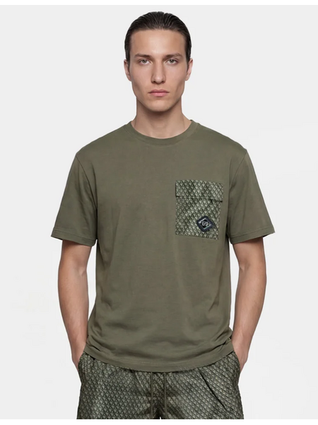 Army groen T-shirt met ronde hals en korte mouwen. Op de borst zit een opvallende borstzak in een all-over monogram print met ritssluiting. Rechtsonder op de zak is een ruitvormig XPLCT logo patch aangebracht. De basis van het shirt is effen, waardoor het monogram detail extra goed tot zijn recht komt. Comfortabele pasvorm die je dagelijks pakt.