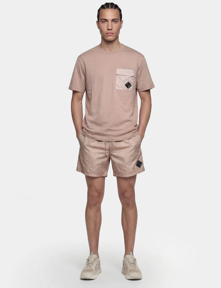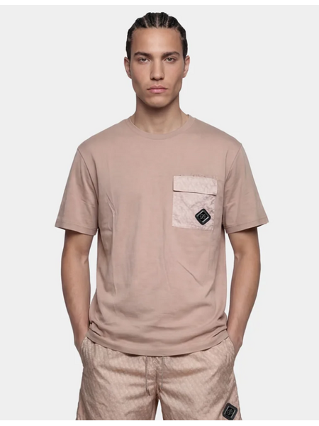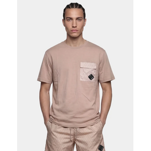 Beige heren t-shirt met ronde hals en korte mouwen. Op de borst zit een opgestikte zak in een licht afwijkende stof met subtiel patroon, afgewerkt met een zwart ruitvormig XPLCT logo. De combinatie van twee texturen geeft dit shirt net dat extra detail dat je look naar een hoger niveau tilt. Lekker comfortabel en easy te stylen voor warme dagen.
