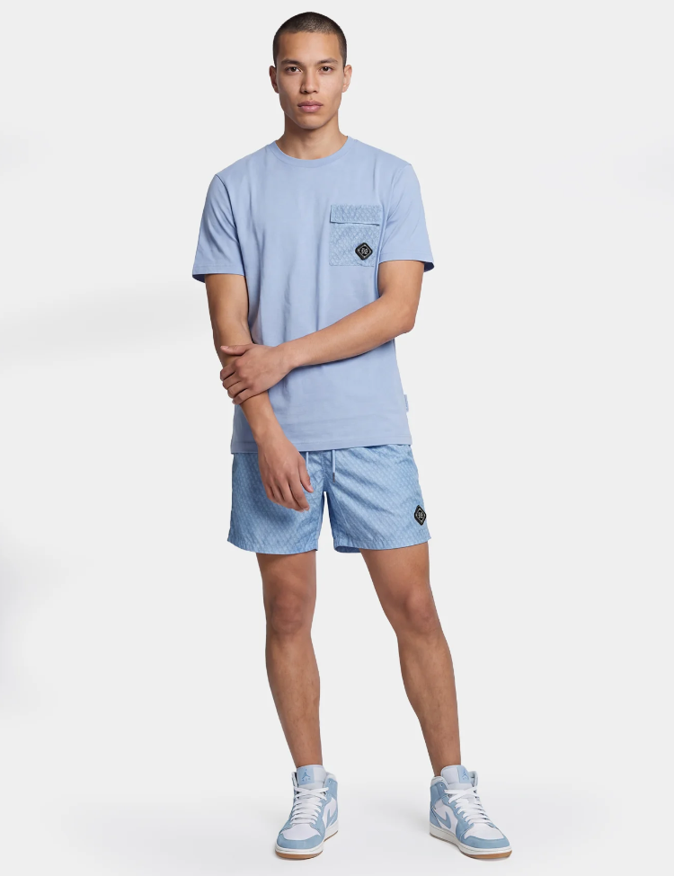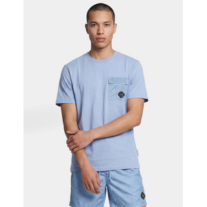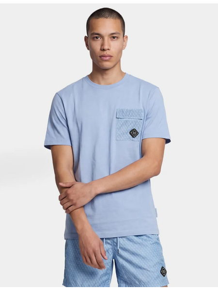 Lichtblauw heren T-shirt met ronde hals en korte mouwen. Op de borst zit een opgestikte zak met monogram print en een rubber XPLCT logo badge. De zak heeft een contrasterende afwerking die het shirt net dat extra detail geeft. Comfortabele pasvorm, ideaal om te combineren op warme dagen.